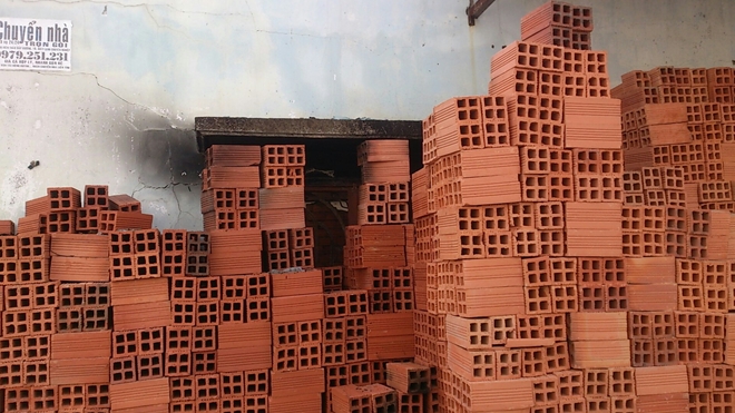 | Một cửa sổ của căn nhà bị gạch che phủ |