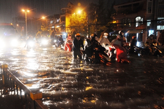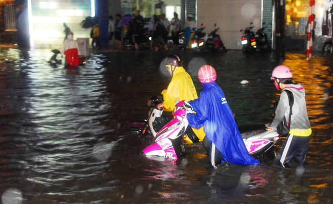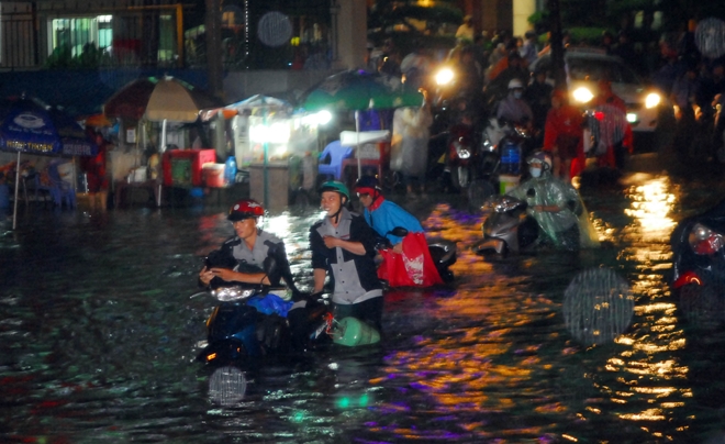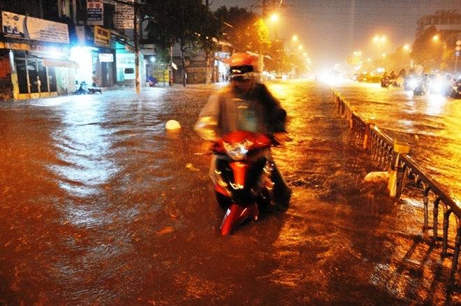 Cơn mưa với lưu lượng lớn tại TP. HCM chiều 15/9 kéo dài đến hơn 21h cộng thêm ảnh hưởng của nước triều dâng cao khiến hàng trăm tuyến đường tại các quận bị ngập trong nước.
