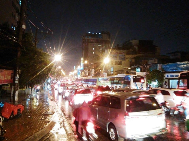 Chị Nguyễn Hoài Phương Khanh (nhà trên đường An Dương Vương, quận 6 cho biết, đi đại lộ Võ Văn Kiệt về nhà để tránh ùn ứ và ngập nước nhưng khi đến giao lộ An Dương Vương và Võ Văn Kiệt cũng bị kẹt cứng bởi nước ngập, xe chết máy.