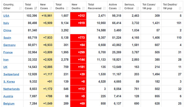 Tại Mỹ, với 16.961 ca nhiễm mới và 312 ca tử vong mới, nước này hiện đã bỏ xa Trung Quốc và Italy về số người mắc COVID-19 với 102.396, số người tử vong vọt lên con số 1.607 ca.