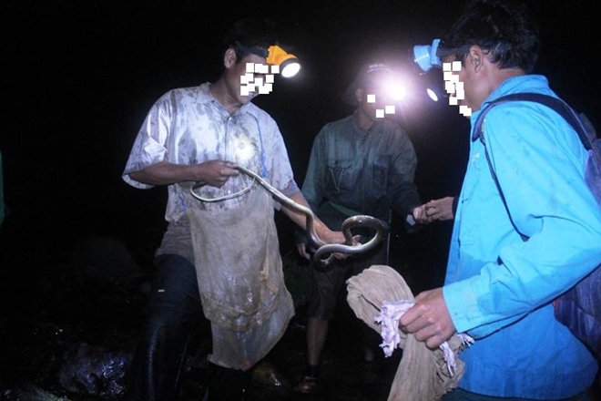 Anh đèn pin sáng quắc rọi thẳng vào mắt khiến con vật bị chói, không biết đâu là đường để lẩn trốn. Con vật xấu số đầu tiền ngơ ngác giữa đám thợ săn vây quanh.