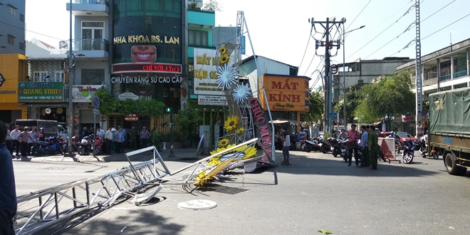 Tại hiện trường dàn sắt làm cổng chào nằm chắn ngang đường Hậu Giang. Để khắc phục sự cố, Công an quận 6 đã điều động nhiều lực lượng, phong tỏa một số tuyến đường chuyển hướng giao thông.