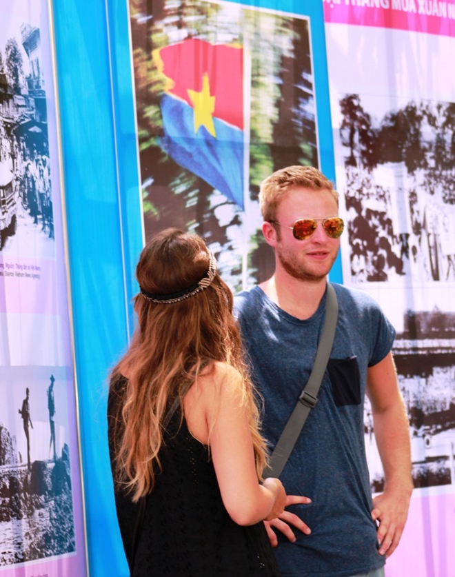 | Nhiều du khách nước ngoài chiêm ngưỡng những bức ảnh lịch sử cùng với những bức ảnh ghi lại khoảnh khắc phát triển và đổi mới của TPHCM trong 40 năm qua. |
