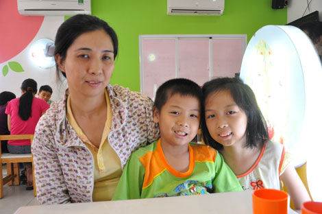 | Cô giáo Trần Thị Sương và 2 con tại Bệnh viện Truyền máu và Huyết học trong lúc chờ được truyền máu. |