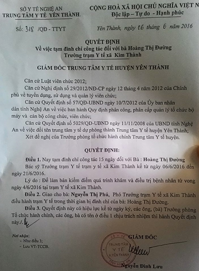 Ngày 9-6, theo tin từ Trung tâm y tế huyện Yên Thành (Nghệ An) cho biết, đơn vị vừa ra quyết định tạm đình chỉ công tác 15 ngày đối với bà Hoàng Thị Đường- Trạm trưởng Trạm y tế xã Kim Thành, vì liên quan đến việc tiêm thuốc kháng sinh cefotaxim, khiến một bệnh nhân tử vong.