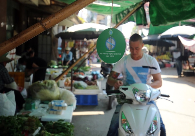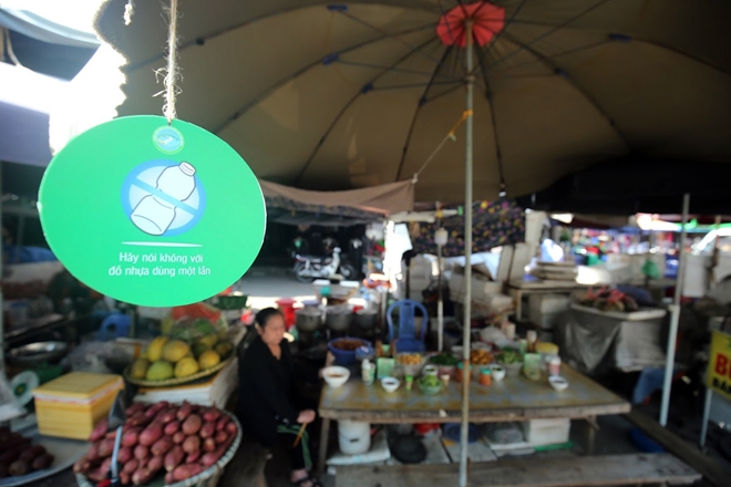 | Tại các hàng quán, từ bán đồ dùng gia dụng, quần áo cho tới bán rau đều treo những tấm biển hạn chế ống hút, cốc nhựa và hạn chế rác thải nhựa. |