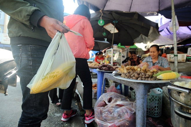 | Một vị khách mua ngô luộc được người bán hàng đựng bằng túi nilon sinh học. |