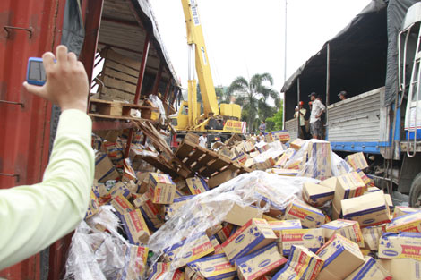 Xe container lật, hàng ngàn thùng sữa ‘lăn’ trên đường