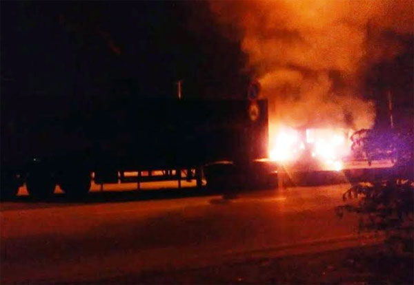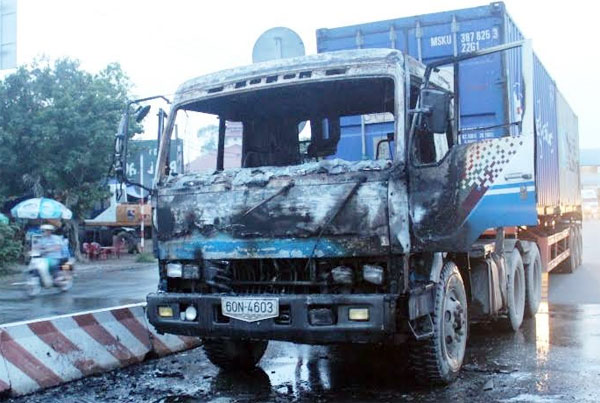 Ngọn lửa nhanh chóng bao trùm toàn bộ phần đầu xe nên dù người dân đã huy động bình chữa cháy mini dập lửa nhưng không thể khống chế. Nguy cơ ngọn lửa lan sang thùng container chứa hàng.