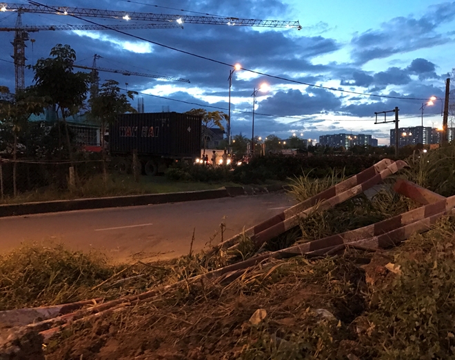 Khi đổ dốc cầu Giồng Ông Tố 2 (phường An Phú, quận 2, TP Hồ Chí Minh) xe đầu kéo được cho là mất lái hất tung hàng loạt dải phân cách bằng bê tông rồi lao sang phần đường ngược lại.