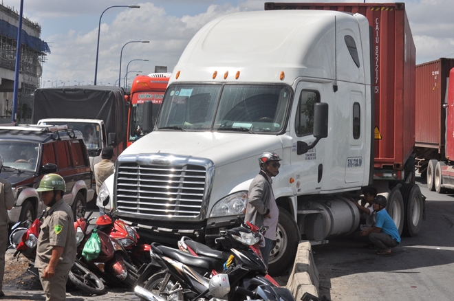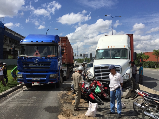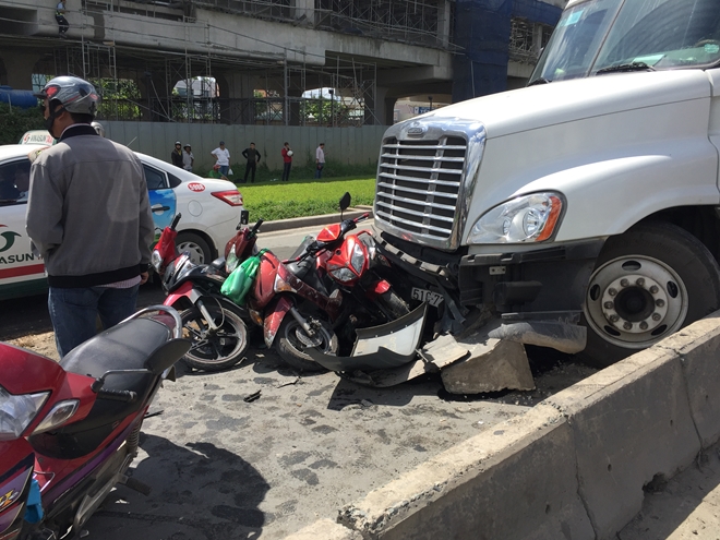 Chưa dừng lại xe đầu kéo tiếp tục ủi một đoạn phân cách bằng bê tông sau đó tông vào 4 xe gắn máy trên làn xe 2 bánh. Vụ tai nạn khiến xe 4 chỗ và 4 xe gắn máy bị hư hỏng nặng, nhiều người bị thương, trong đó anh Trung (27 tuổi, ngụ quận 2) bị gãy chân được đưa vào bệnh viện chữa trị.