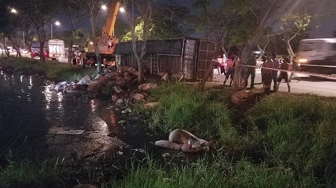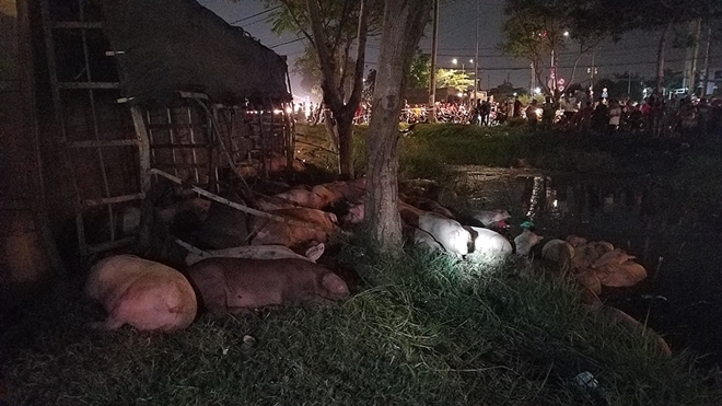 Thời điểm trên một số người đang câu cá tại mương nước trên đại lộ phát hiện sự cố nên nhanh chân chạy thoát, tài xế xe tải bị thương nhẹ. Tại hiện trường hàng chục con heo bị rơi xuống mương nước, bì bõm, một số chết ngộp. Dù lo ngại về dịch tả lợn châu Phi, song người dân đã phụ tài xế thu gom số heo chết trên đưa vào bờ. Tài xế xe tải cho hay, số heo trên được chở từ TP Hồ Chí Minh về miền Tây.