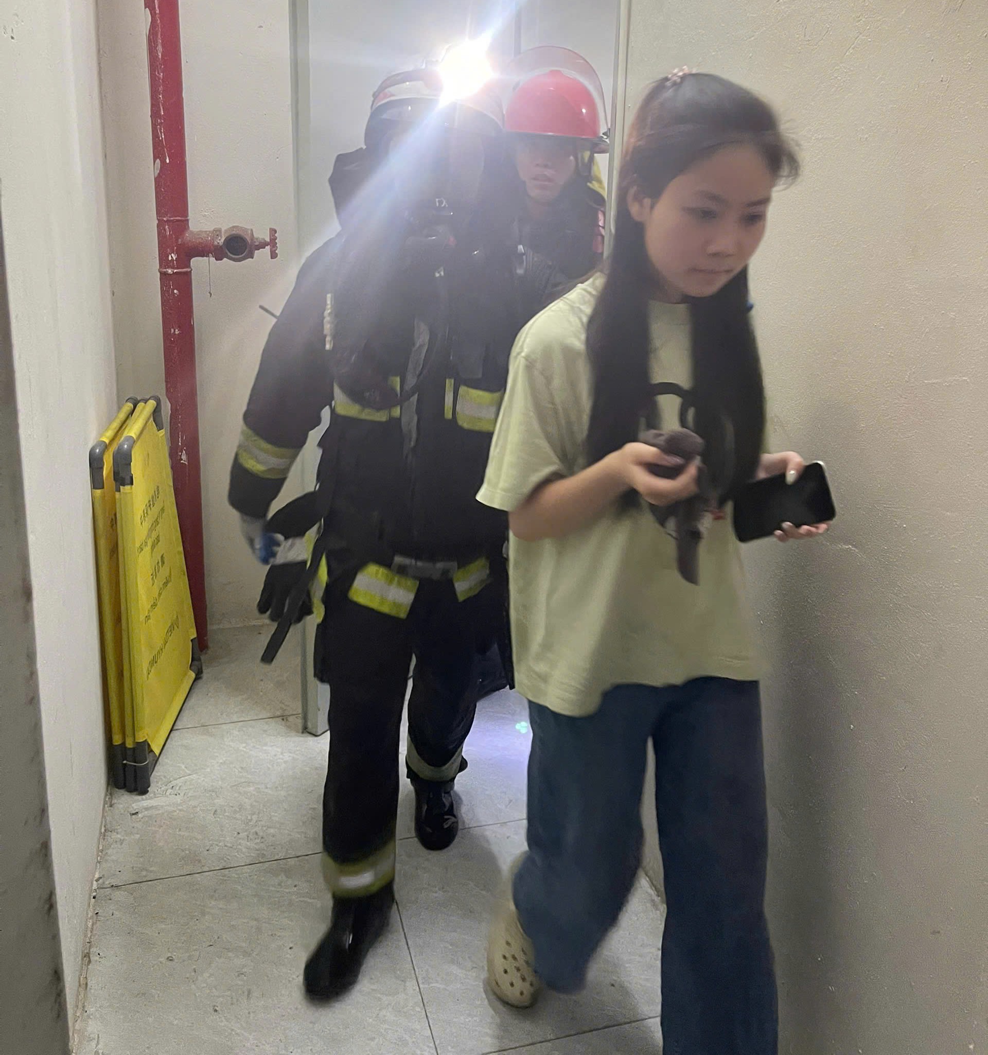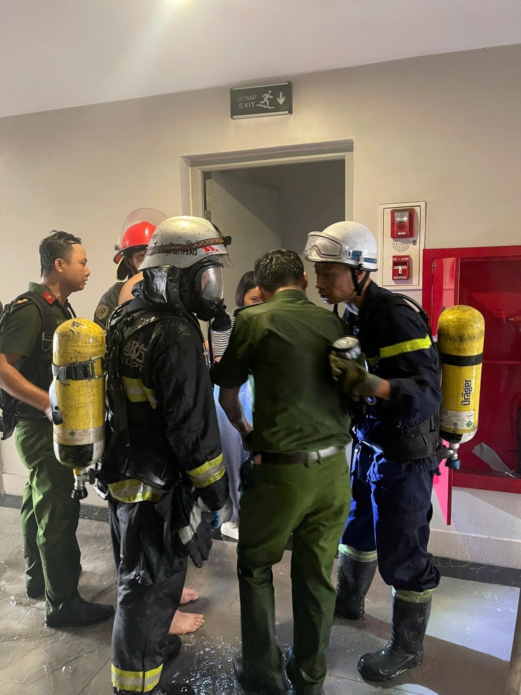Qua công tác trinh sát, nắm tình hình cháy xảy ra tại tầng 6, căn hộ 604, có nhiều khói khí độc phát tán ra hành lang và xác định có người mắc kẹt tại căn hộ 601, chỉ huy chữa cháy ngay lập tức chỉ đạo CBCS triển khai sử dụng bình thở và các thiết bị chuyên dụng tiếp cận khu vực xảy ra cháy để tìm kiếm, hướng dẫn 3 người thoát nạn theo đường buồng thang bộ xuống dưới khu vực an toàn, đồng thời chỉ đạo tiếp tục tìm kiếm, kiểm tra các căn hộ lân cận.