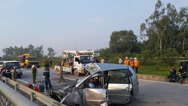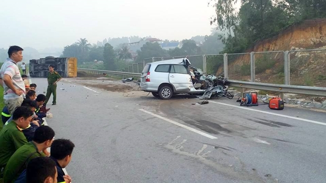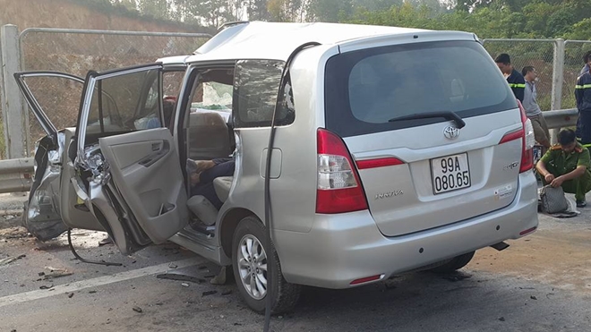 Đang chạy trên đường cao tốc Hà Nội - Thái Nguyên, chiếc Innova bất ngờ đâm vào đuôi xe tải chở cát cùng chiều, rồi quay ngang cắm đầu vào dải phân cách bằng sắt bên đường, vụ TNGT khiến 3 người Hàn Quốc trong xe tử nạn.
