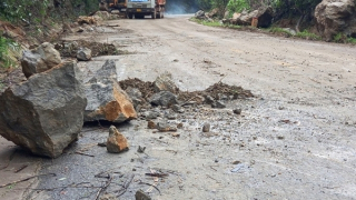 Mưa lớn, đá lở rơi xuống đường gây ùn tắc giao thông tại Sơn La