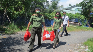 Chẳng ai bảo ai, các anh nhanh chóng cùng các thành viên công tác tại chốt đến bên bà con, gửi trao những suất ăn nhanh gồm bánh ngọt, sữa và liên tục động viên mọi người dùng bữa cho mau chóng lại sức.