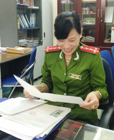 | Đại úy Hoàng Thị Hiệp đọc thư của phạm nhân gửi cho mình. |