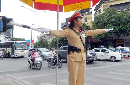 Nữ Cảnh sát giao thông đang làm nhiệm vụ tại chốt giao thông Cửa Nam. |