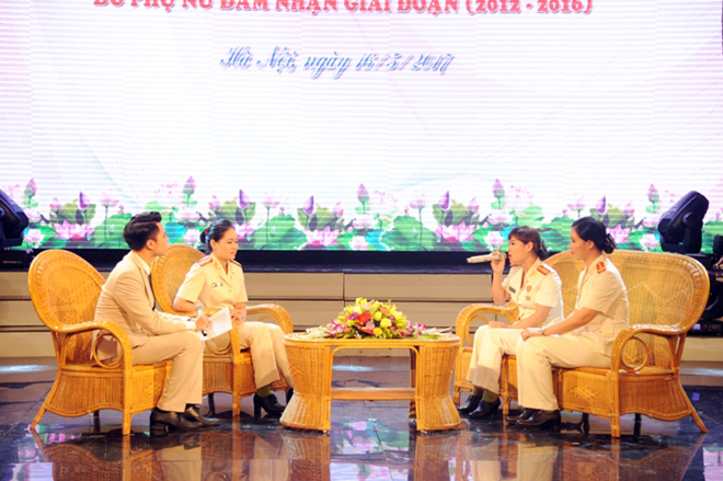 | Trung tá Trần Thị Mừng (người cầm micro) đang giao lưu với khán giả trong một chương trình truyền hình. |