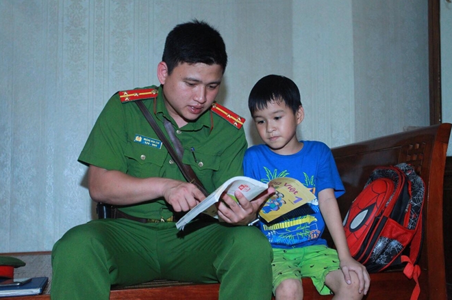 Một buổi chiều giữa tháng 9, tôi theo Thượng úy Hoàng Hoa Sơn đến thăm căn phòng trọ nằm sâu trong một con ngõ ở phố Trần Hưng Đạo của gia đình cháu Quang Anh. Thấy chú Sơn đến, thằng bé ríu rít kể đủ thứ chuyện ở lớp, rồi lôi sách ra đọc những bài đã được học. Nhìn hai chú cháu vui vẻ nói đủ thứ chuyện ở lớp, tôi chợt nhận ra với thằng bé con này, nó đã coi chú CSKV là người thân thiết.