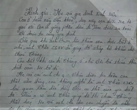 Trong thư ghi: "Vừa qua, khi anh Am lên thăm con, được biết ở nhà, anh Thảo cảnh sát khu vực đã giúp đỡ nhập hộ khẩu cho cháu Thắng. Con biết khi con đi, Thắng ở nhà với bà thiếu thốn tình cảm. Mẹ bỏ đi. Mẹ và các anh chị ạ! Nhận được tin trên, con thật cảm động, con không nghĩ là anh Thảo cảnh sát khu vực lại quan tâm đến từng việc cụ thể của gia đình...".