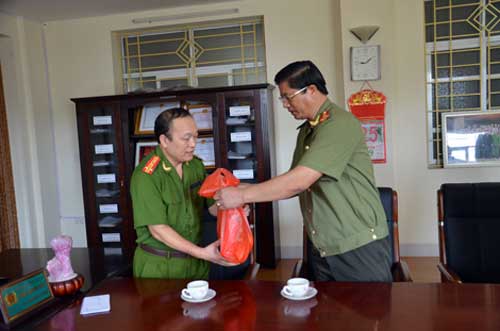 Đại tá Đinh Tiến Quân, Giám đốc Công an tỉnh Lào Cai tặng quà cho Đại tá Giàng Ly Pao, trong hoạt động tri ân các gia đình thương binh, liệt sĩ nhân kỷ niệm 67 năm Ngày thương binh, liệt sĩ (27/7/1947 – 27/7/2014). |