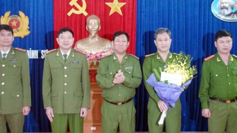 Đồng chí Lê Hồng Thắng (cầm hoa) trong một lần được Ban Giám đốc Công an TP Hải Phòng biểu dương vì có thành tích xuất sắc khi tham gia phá án. |