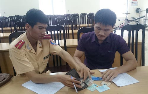 | Thiếu uý Nguyễn Duy Thanh, trao trả lại chiếc ví cho anh Nguyễn Quang Vinh. |