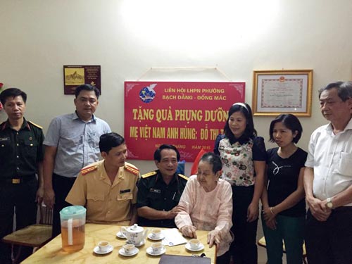 | Thiếu tá Huấn (thứ 3 từ trái sang) tặng quà cho mẹ Việt Nam anh hùng Đỗ Thị Thiện. |