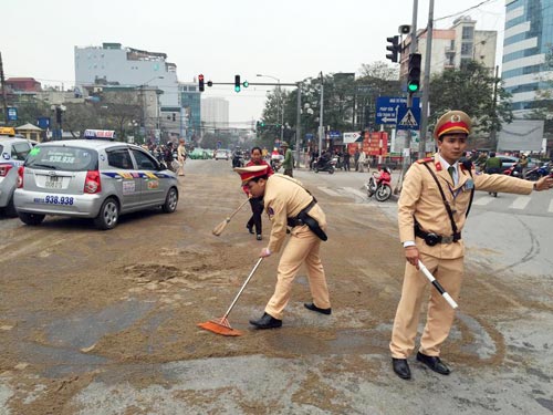 | Cảnh sát giao thông Đội 4 khắc phụ sự cố dầu đổ ở phố cầu Mai Động. |