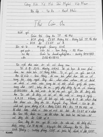Để thể hiện lòng biết ơn với các chiến sĩ Cảnh sát giao thông Đội 4, chị Thắm đã viết thư cảm ơn. Trong thư, chị Thắm không khỏi xúc động và không giấu nổi vẻ sung sướng khi mẹ mình đã được trở về nhà bình an vô sự với sự giúp đỡ tận tình của các chiến sĩ Cảnh sát giao thông.