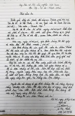 | Thư cảm ơn của anh Nguyễn Quang Vinh. |
