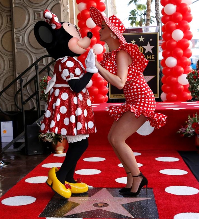 | Katy Perry trong trang phục ton-sur-ton với chuột Minnie. Là một trong những biểu tượng âm nhạc và thời trang của thế giới hiện nay, Katy Perry vẫn tâm sự rằng, giống như hàng triệu cô gái khác trên thế giới, cô "thần tương" Minnie từ nhỏ và tuổi thơ của cô gắn liền với nàng chuột dễ thương này. |