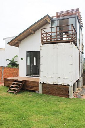 Mẫu nhà xếp chồng xô lệch, cột chống đỡ: Mang dáng dấp một ngôi nhà sàn nơi cao nguyên. Nhưng mẫu nhà này kỳ thực được lắp ráp từ các khối container. Hai khối được xếp chồng lên nhau, xô lệch tầng 2 để tạo góc thư giãn hệt ban công nhà phố. Container tầng 2 được dở vỏ lắp kính.