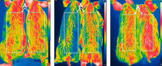 | Hình ảnh là hình ảnh hồng ngoại của lợn 6 tháng tuổi được thực hiện ở mức bằng không, hai, và bốn giờ sau khi tiếp xúc với cái lạnh. Những con lợn biến đổi ở bên phải hình ảnh. Các hình ảnh cho thấy khả năng chịu lạnh của lợn được cải thiện sau khi chèn gen mới. |