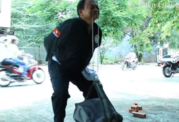 | Võ sư Kim Tuấn biểu diễn màn mắt gánh đồ vật. |