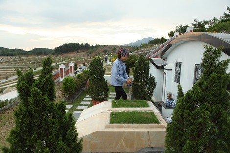 Chúng tôi đến Công viên Tâm linh Lạc Hồng Viên đúng những ngày lễ Vu Lan, giữa lưng chừng đồi bao la, những ngôi mộ nằm tĩnh lặng dưới những làn khói hương nghi ngút. Thấp thoáng là những người phụ nữ nhỏ bé bên những lùm cây, trong những khuôn viên "biệt thự mộ".