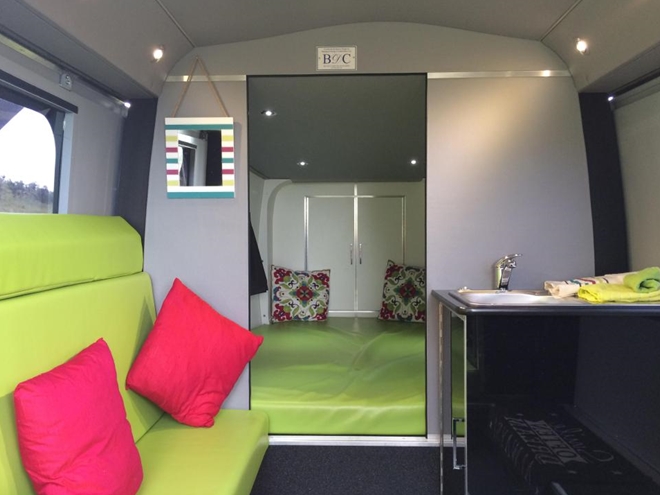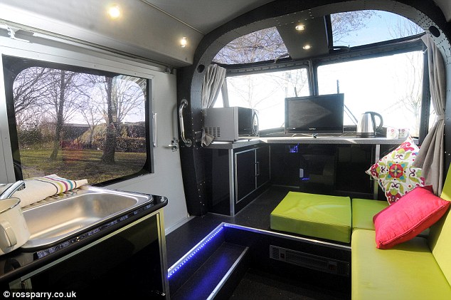 Giường ngủ đủ chỗ cho 2 người và sofa có thể biến thành nơi nghỉ cho 2 người nữa. Chủ sở hữu cũng gắn thêm một phần hiên gỗ bên ngoài trực thăng để mọi người có thể ngồi uống trà, ngắm cảnh công viên, hồ nước gần đó.