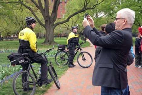 Lực lượng cảnh sát đảm bảo cho an toàn Nhà Trắng khá thân thiện. Khi tôi tới đây thì trùng lúc có một nguyên thủ Nhật tới thăm. Trên nóc Nhà Trắng lố nhố nhân viên an ninh đang triển khai gì đó. Đảm bảo an toàn thì du khách cần lùi xa hàng rào khoảng 50 mét. Truyền đạt tới du khách và dân là những chàng cảnh sát đi xe đạp tươi cười với một thái độ có vẻ áy náy. Xe đẹp dáng thể thao, mũ bảo hiểm đẹp kèm trang phục vàng chanh, nụ cười luôn rạng rỡ. Du khách lùi ra xa một cách vui vẻ vì họ chẳng có lý do gì để thắc mắc trước những nụ cười thân thiện kia.