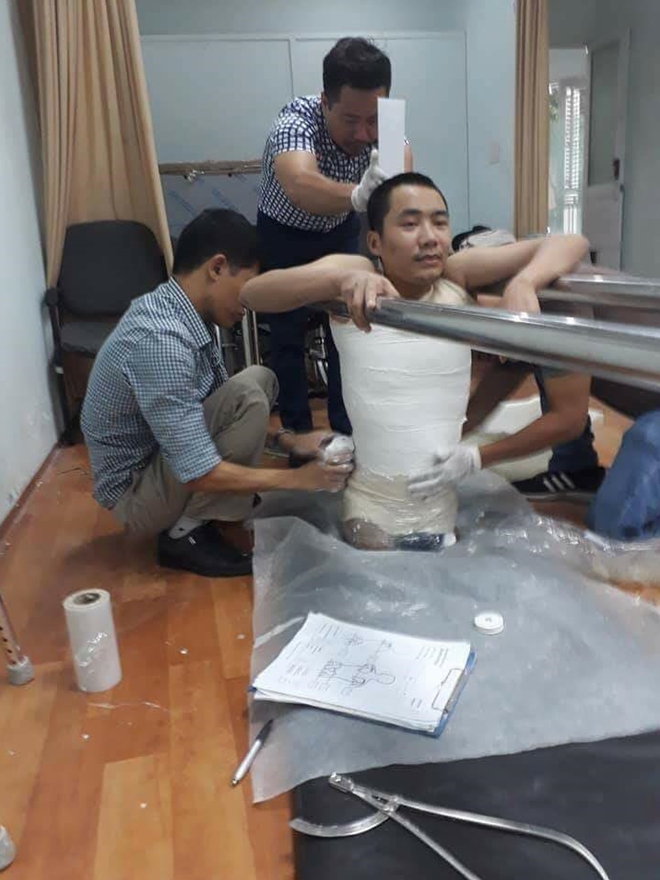 | Bó xương sống và lắp đặt áo giáp cho Hảo |
