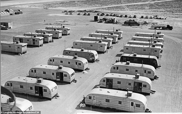 | Những chiếc Rơ moóc tại Khu vực 51 là chỗ ngủ của phi công lái máy bay U-2 như Hervey Stockman và Tony Bevacqua, trong khi học lái máy bay do thám đầu tiên của CIA. |
