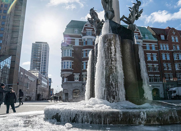 | Nước trong vòi phun nước đóng băng ở trung tâm Malmo (Thụy Điển). |