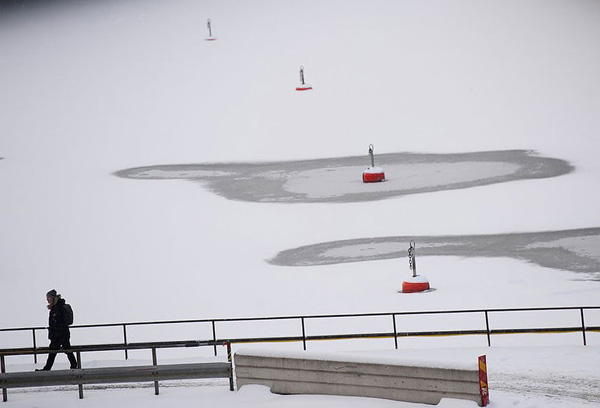 | Một người đàn ông đi ngang qua vùng biển đóng băng ở cảng Stockholm (Stockholm, Thụy Điển). |