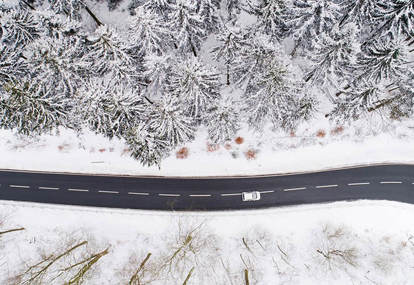 | Mùa đông ở Saxony (Đức). Một chiếc xe chạy dọc theo con phố giáp với một khu rừng trắng tuyết. |
