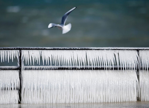 | Một con chim mòng biển bay qua tấm lan can đóng băng trên bờ hồ Geneva trong một ngày mùa đông đầy gió, tại Coppet (Thụy Sĩ). |