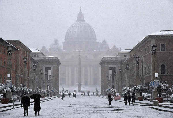 | Dòng người đi trên Quảng trường St Peter trắng tuyết ở Vatican. |