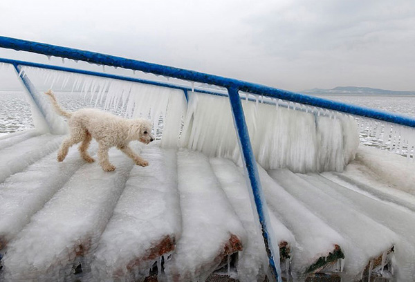 | Chú chó đi trên các bật thang bị đóng băng của bờ hồ Balaton ở Fonyod, cách Budapest (Hungary) 148 km về phía tây nam. |
