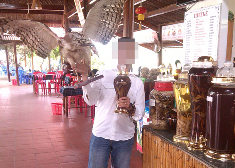 Tại quán cà phê vỉa hè khu vực Hồ Con Rùa (Q.1, TP HCM), chị Hoài (tên người bán thú rừng) nhoẻn miệng cười lịch thiệp trước cánh mày râu đang say sưa hàn huyên. Chị Hoài rao: "Thú rừng đảm bảo nuôi sống 100%, ngâm rượu tuyệt đỉnh, làm mồi nhậu hảo hạng…".