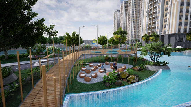 2, được phân tầng theo độ sâu mực nước, thiết kế uốn lượn và xen kẽ giữa 12 tháp tòa nhà, không chỉ nâng tầm cảnh quan dự án, tạo vẻ đẹp mà còn có tác dụng điều hòa, giúp không khí trở nên tươi mát hơn mỗi ngày.