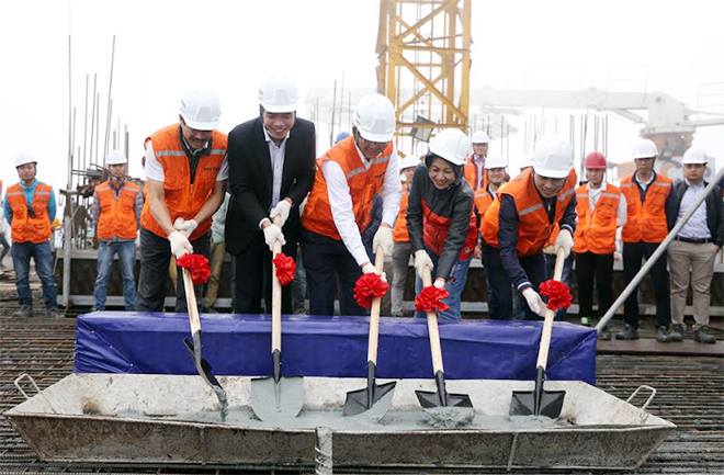 | Đại diện của chủ đầu tư Tập đoàn FLC, đơn vị thi công FLC Faros và Ban quản lý dự án FLC Twin Towers thực hiện nghi lễ cất nóc. |